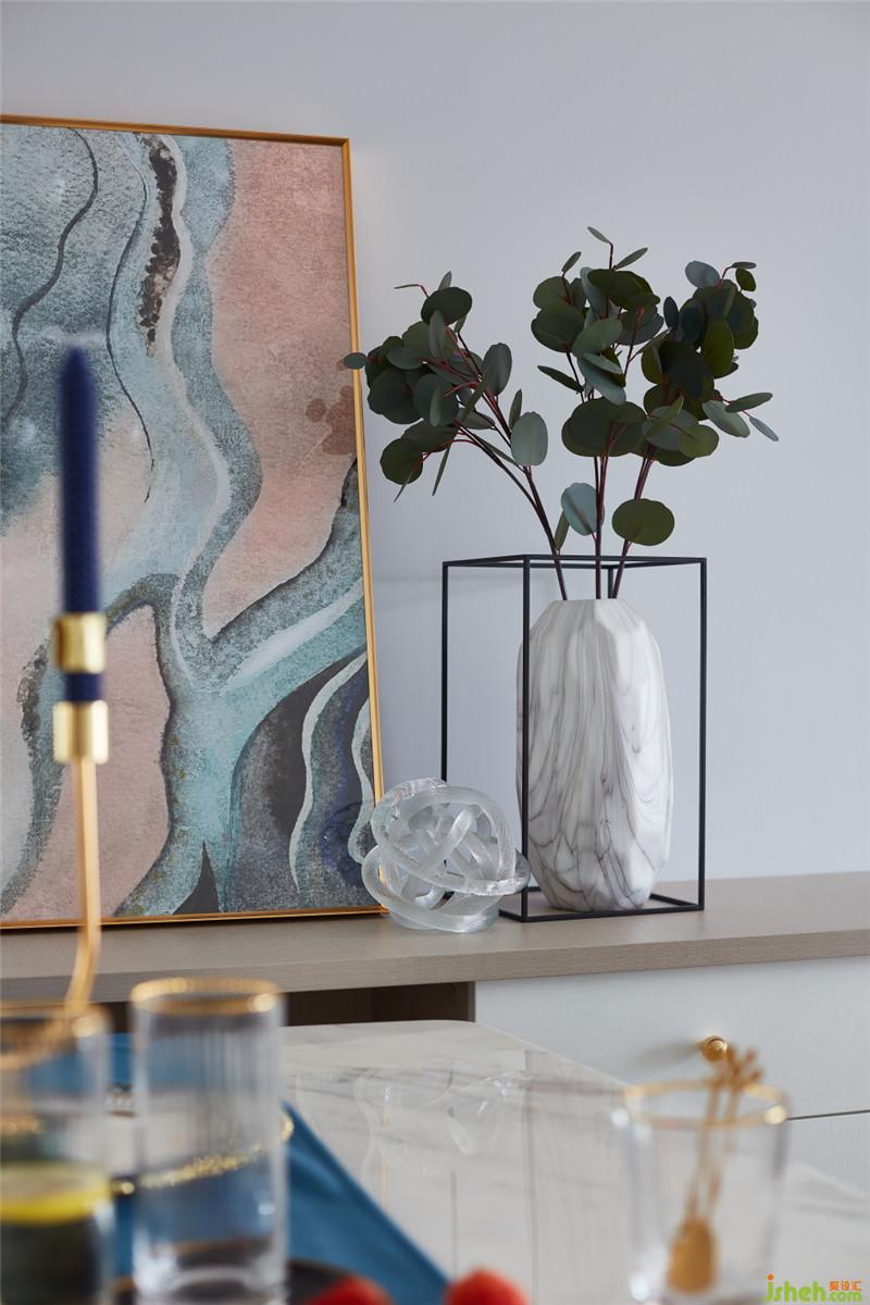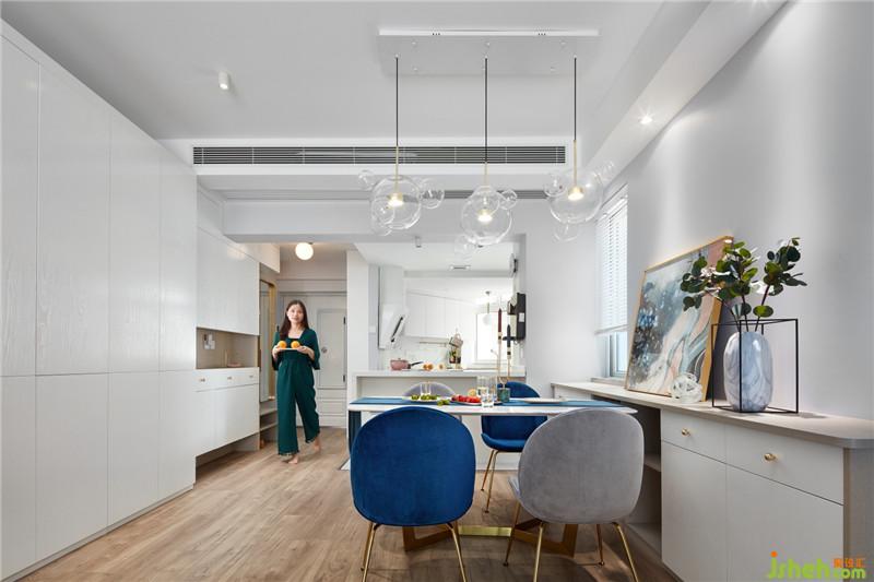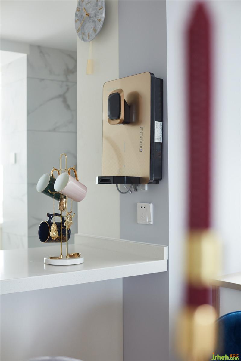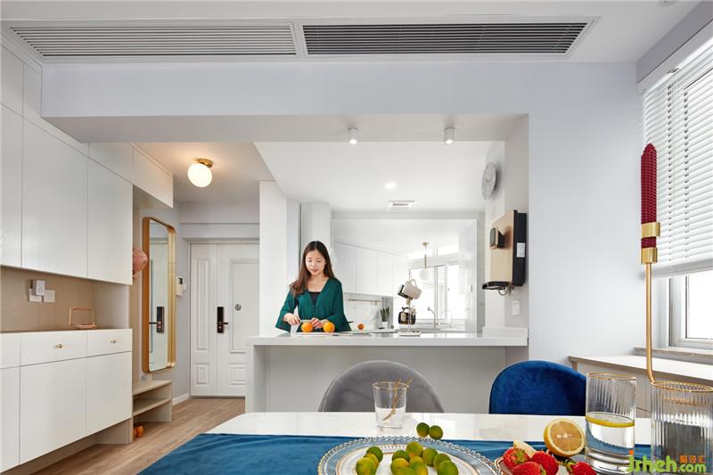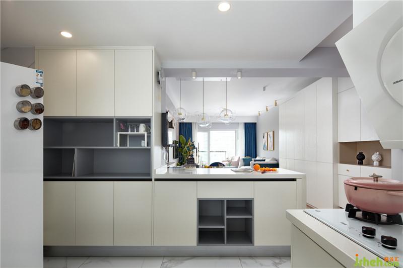 廚房的墻面與地面采用相同的柔光仿爵士白瓷磚,讓空間的視覺(jué)達(dá)到整體化一。白色的櫥柜,白色的臺(tái)面,沒(méi)有過(guò)多復(fù)雜的點(diǎn)綴,清新之風(fēng)迎面而來(lái)。