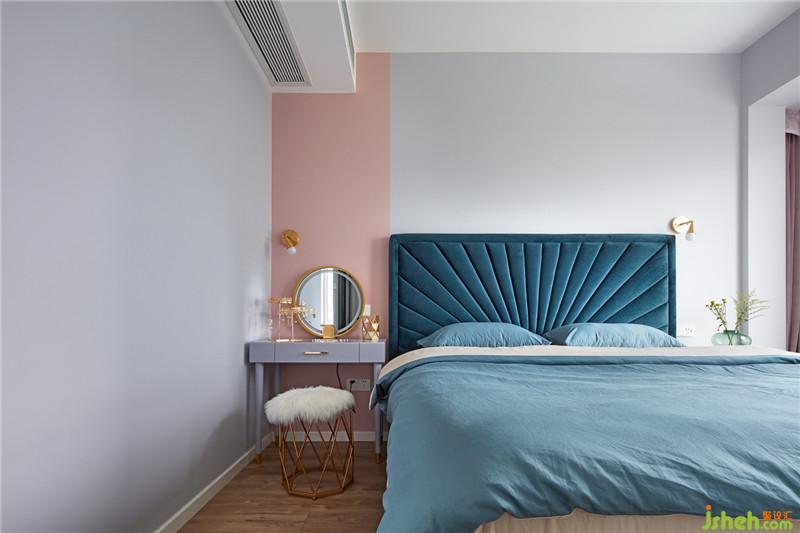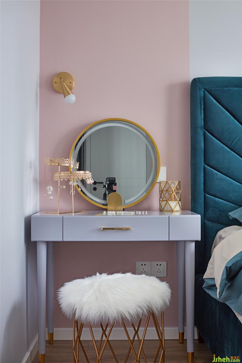 主臥床的靠背本身就是一道裝飾的背景,所以在設(shè)計墻面中采用了色塊搭配的處理手法。藕粉色的色塊,讓整個空間有了一道亮麗的風(fēng)景線。粉與墨綠的搭配也讓空間的層次多了一道體現(xiàn)。精致的金色床頭壁燈與金色的羽毛主燈相互呼應(yīng),給空間帶來了品味柔美的一面。