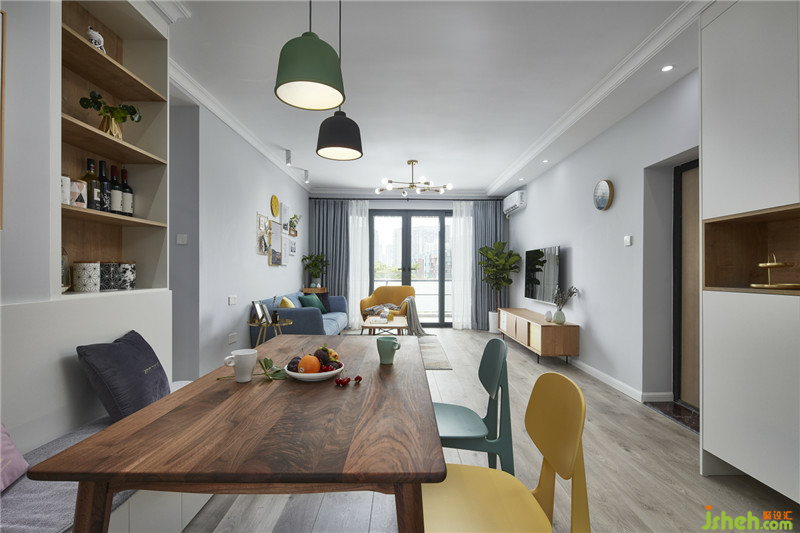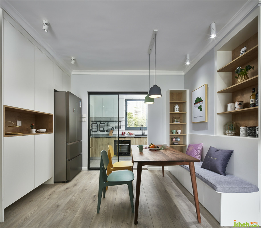 為保證客廳與餐廳的通風(fēng)順暢,所以在入戶玄關(guān)區(qū)沒有設(shè)計玄關(guān)屏風(fēng)隔斷。入戶左側(cè)是一組收納組合柜,柜子的整體設(shè)計比例把鞋柜與冰箱完美融合。