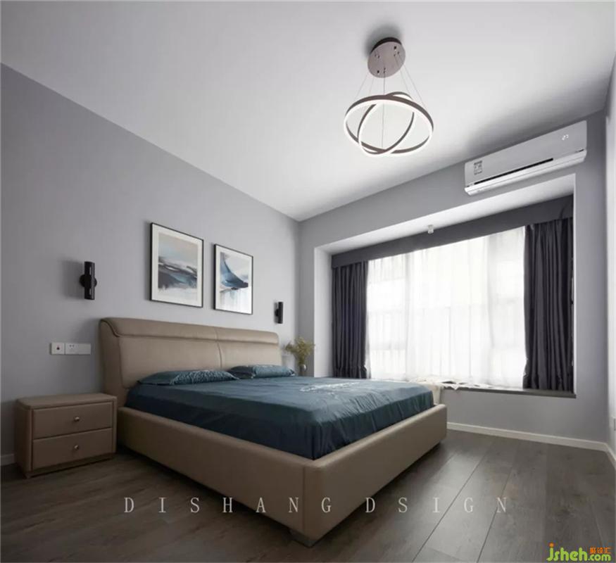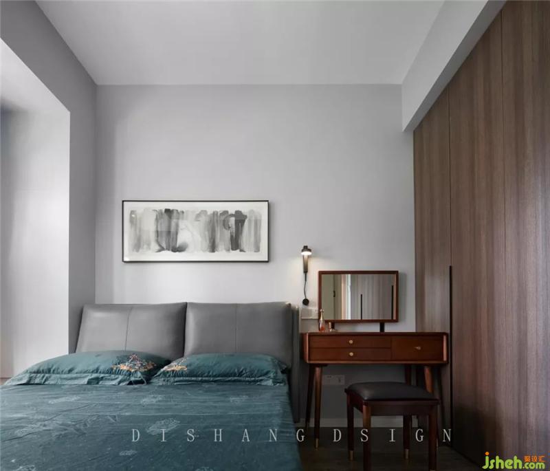 次臥黑胡桃木梳妝臺(tái)、藍(lán)色床品與淺灰色產(chǎn)生強(qiáng)烈的對(duì)比,給人一種時(shí)尚前衛(wèi)的感覺(jué)。室內(nèi)設(shè)計(jì)師