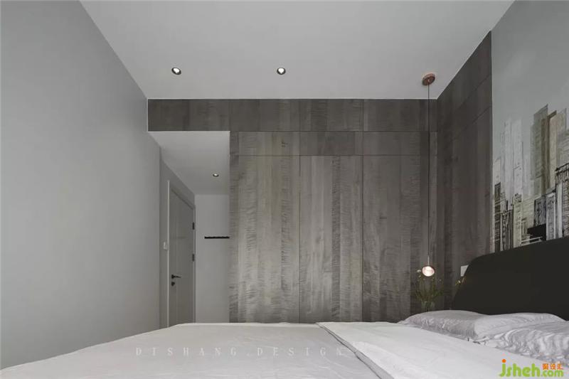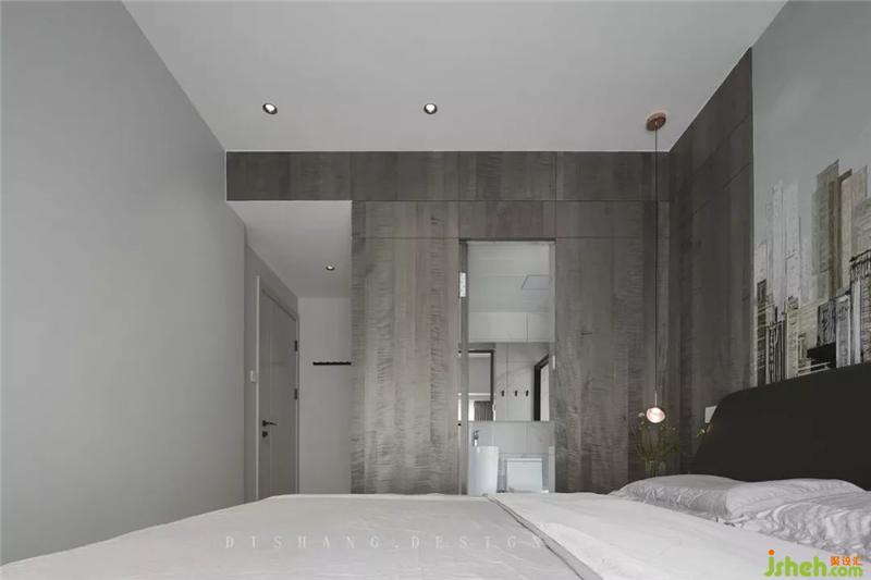 我們通過設計調(diào)整主臥與主衛(wèi)之間的連接,把主衛(wèi)門做成染色楓木KD板隱形門,隱藏于墻壁中,延伸視覺的同時又有整體裝飾作用。臥室沉穩(wěn)有秩序,優(yōu)雅且富有質(zhì)感的皮質(zhì)雙人床舒適宜人。床頭”City”主題壁紙,是整個空間的點睛之作,讓人產(chǎn)生無盡的遐想。