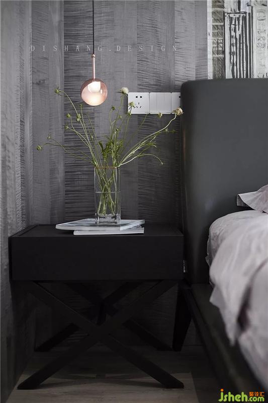 床頭玫瑰金吊燈、造型獨特的床頭柜,空間極富腔調(diào)與藝術感。裝修設計