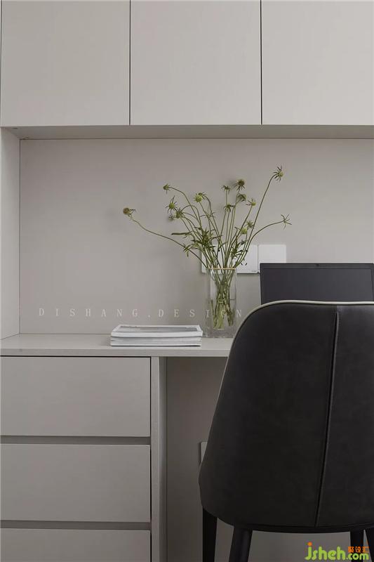 整個書房沒有多余的裝飾,只有榻榻米連體書柜組合?;野咨{(diào)的留白空間,更能讓人靜下心,集中注意力去思考。