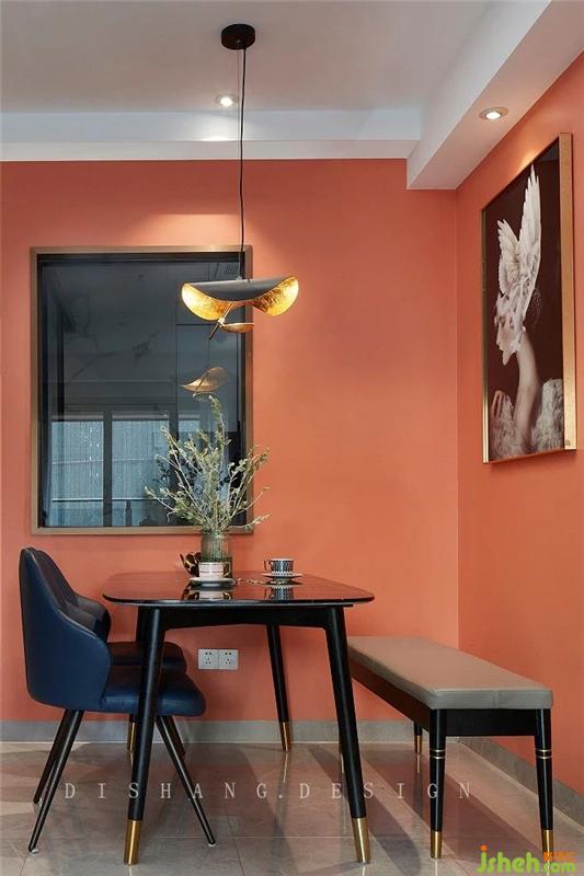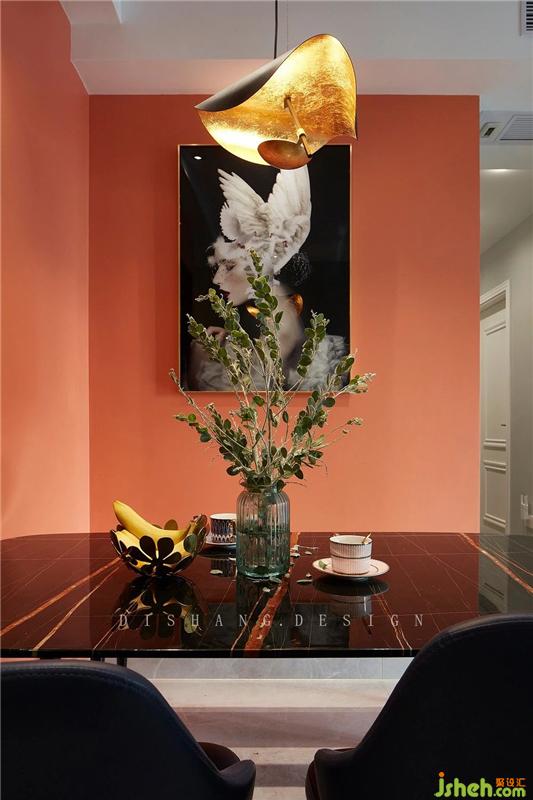 廚房與餐廳間的一扇固定玻璃窗帶來廚房與餐廳的互動,以及空間的通透感;珊瑚紅背景下的餐廳,配上優(yōu)雅的人像畫,仿佛置身于一幅油畫中,不僅視覺上帶來沖擊,整個餐廳氛圍變得更有質感、更加溫馨;金屬吊燈和金屬餐桌腳上下呼應,家的溫暖在其中無限循環(huán)。