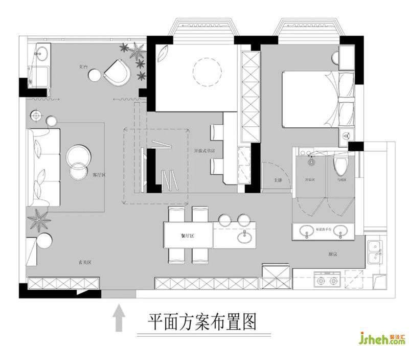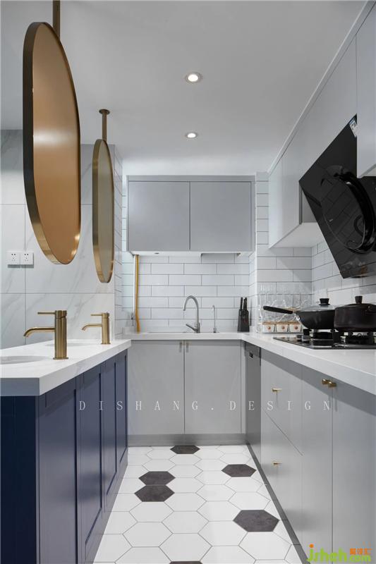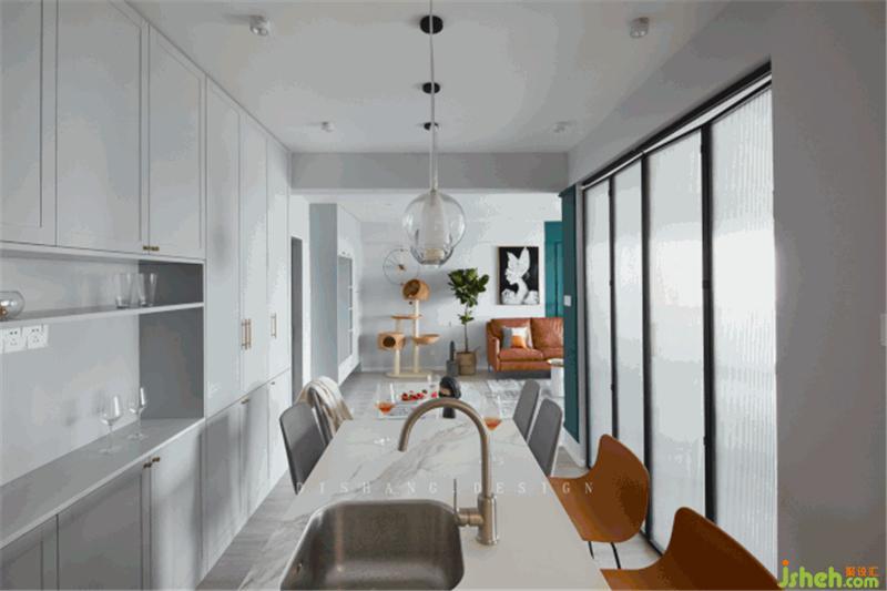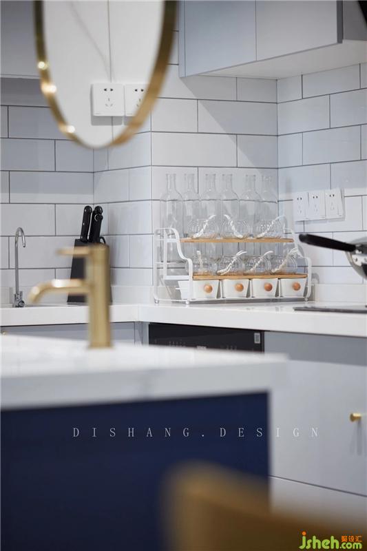 廚房區(qū)域是整個空間的采光弱區(qū),利用白色的瓷磚、淺灰色的柜體來提高廚房的亮度,開放性的廚房不僅加強餐廚之間的聯(lián)系,更使小空間變得通透明亮。室內(nèi)設(shè)計師