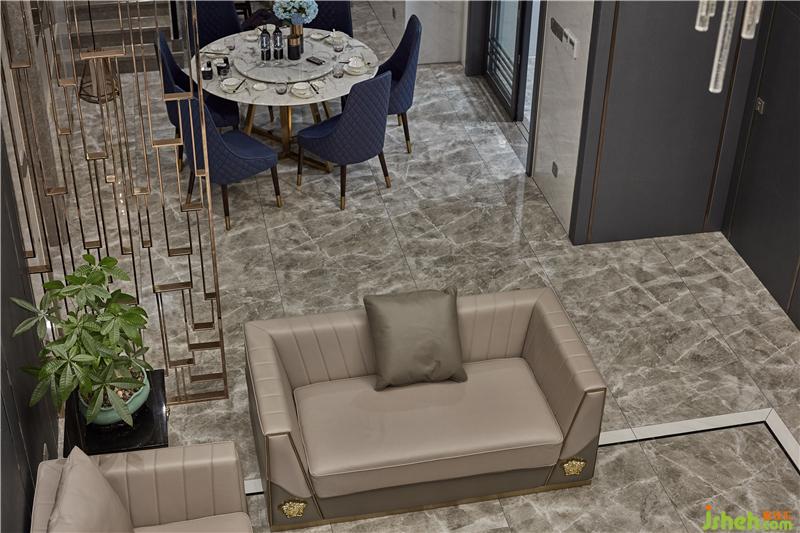 軟裝擯棄了高飽和度色調(diào),選以灰藍、淺咖等,即便是暗金色元素,其明度較低,既彰顯內(nèi)斂的奢華,也與空間格調(diào)相互契合;室內(nèi)設(shè)計師兼顧實用性與舒適性的皮質(zhì)沙發(fā)搭配灰色仿石材地磚,舒適的觸感、清新的配色,塑造別樣的居住美感;