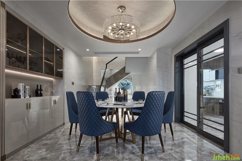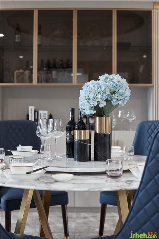 用餐區(qū)圓形天花與爵士白大理石圓桌形成上下呼應(yīng),鮮艷的藍色座椅帶來強烈的沖突感,為空間注入新的活力,營造輕松歡快的氛圍;室內(nèi)設(shè)計師將“雅奢”作為客餐廳設(shè)計的格調(diào)核心,以現(xiàn)代灰與白為主色基調(diào),以金屬的溫潤為氣氛內(nèi)核,用光線和家具、陳設(shè)的點綴使其煥發(fā)出藝術(shù)生命力。