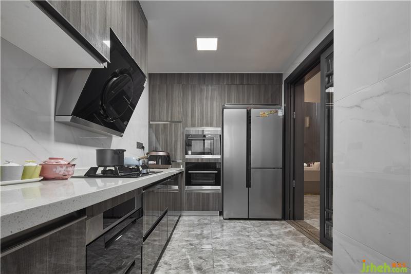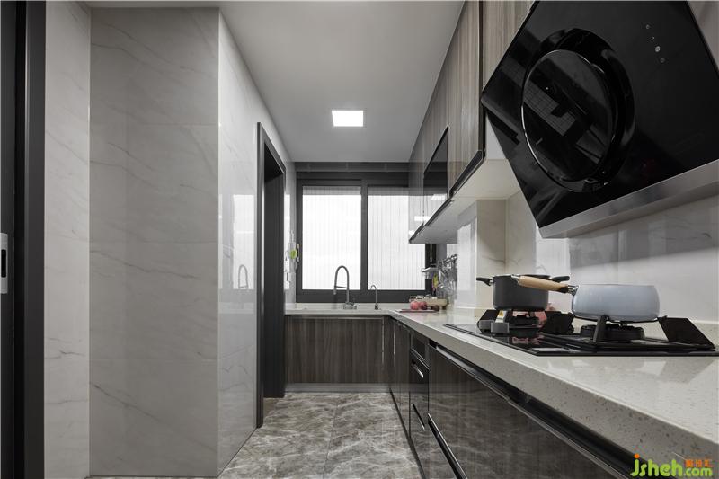 櫥柜與白色墻面在狹長的空間中呈現(xiàn)出層次感,陽光順著窗戶慢慢滲入,將空間照亮?;遗c白、虛與實、抽象與具象,空間營造靜謐而深遠的觀感,身臨其境享受烹飪中帶來的樂趣。