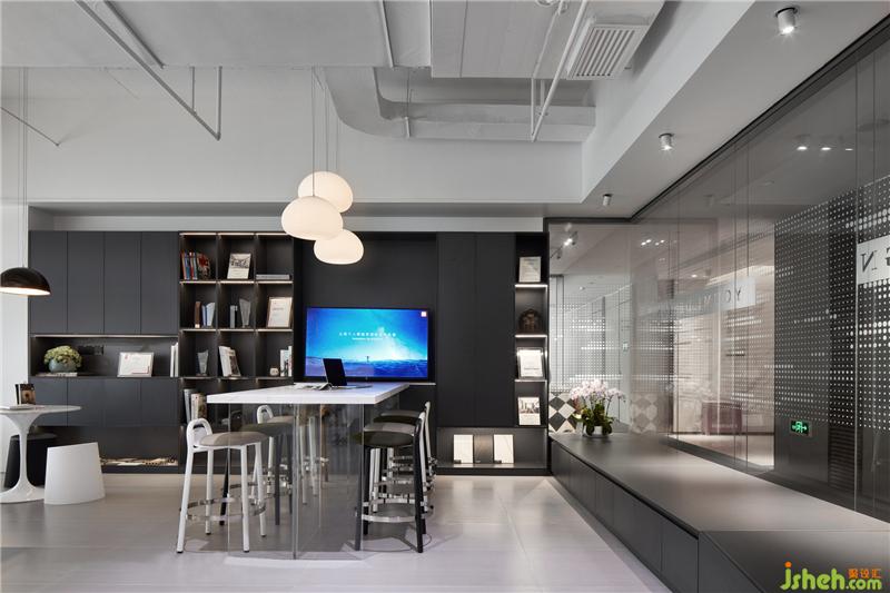 我們?cè)谛蓍e區(qū)設(shè)置兩張大理石小圓桌,休閑時(shí)刻,圍坐在圓桌邊,聊聊工作以外的熱鬧之事,更有利于身心放松,更好的投入到工作中;在辦公設(shè)計(jì)方面,整面墻壁做成黑色書架儲(chǔ)物柜,一直延續(xù)到會(huì)議廳,增加了辦公室的收納功能,也起到展示的作用。
