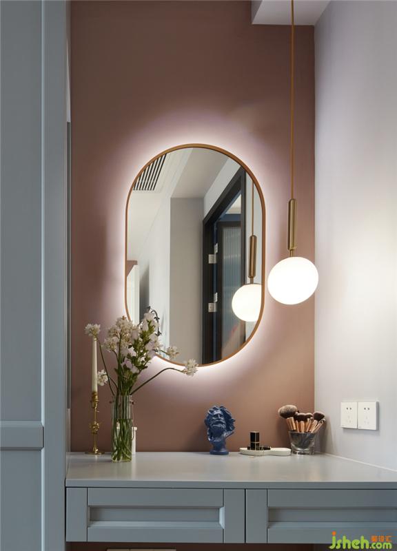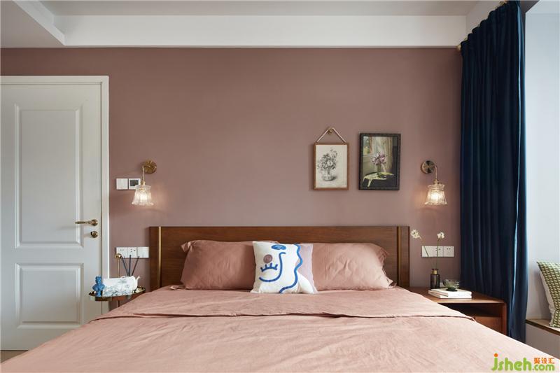 臥室墻面以臟粉色為底色,用白色和金色來描繪居家的形狀,再以飽和度高的藍色調(diào)和空間氛圍,營造一個溫柔、安寧、高級的休憩空間;在軟裝搭配上更加傾向細膩和溫馨,原木雙人床、舒適的床上用品、絨面窗簾、對稱的復(fù)古床頭壁燈散發(fā)出獨特柔軟的氣質(zhì),空間達到平衡。