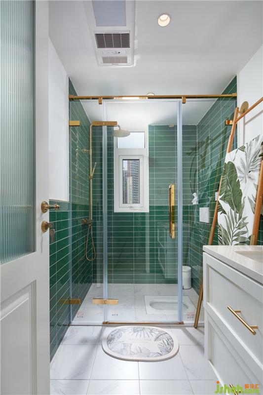次衛(wèi)空間的裝修設(shè)計延續(xù)了客餐廳的整體色調(diào),白色的大理石紋地磚和墨綠色的小方磚、自然元素與現(xiàn)代金屬元素的結(jié)合,次衛(wèi)通透明亮,給人舒適自然之感。
