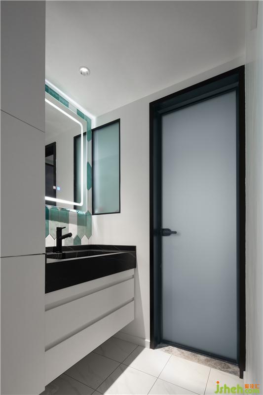 室內(nèi)設(shè)計師選擇綠色的六邊形瓷磚提亮空間色彩,也與客廳遙相呼應(yīng)。不同規(guī)格的五邊形玻璃瓷磚,有序的拼奏在墻壁上,構(gòu)造出一副別致的圖案,帶來視覺上的享受。