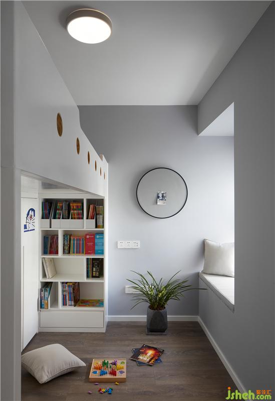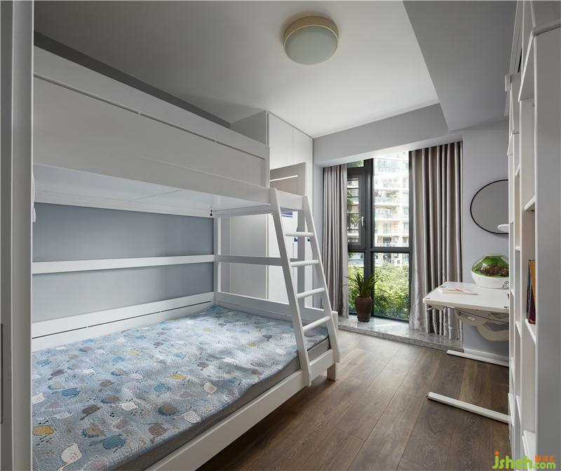 “上床下桌”的設(shè)計,讓小小的兒童房“蓬蓽生輝”。小孩有更多私人的玩??臻g,邊上的儲物柜可以收納書籍,也可以擺放小孩喜愛的物品。