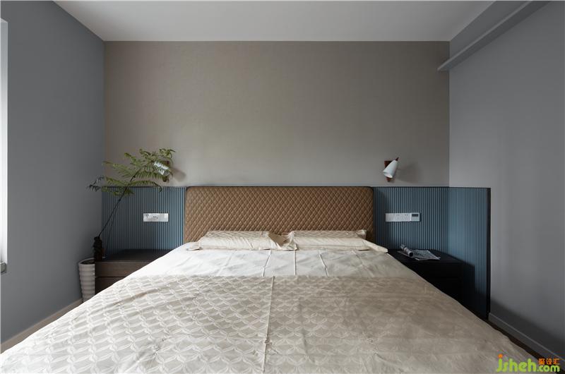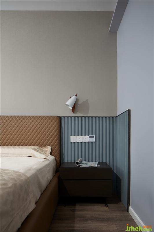 墻面的分色和床頭的拼色高度是連續(xù)呼應(yīng)的,整個空間更生動。床頭的霧霾藍(lán)波浪板,延伸劃出舒適的比例,空間形成包裹感,有助于產(chǎn)生安全感,更有助于睡眠。