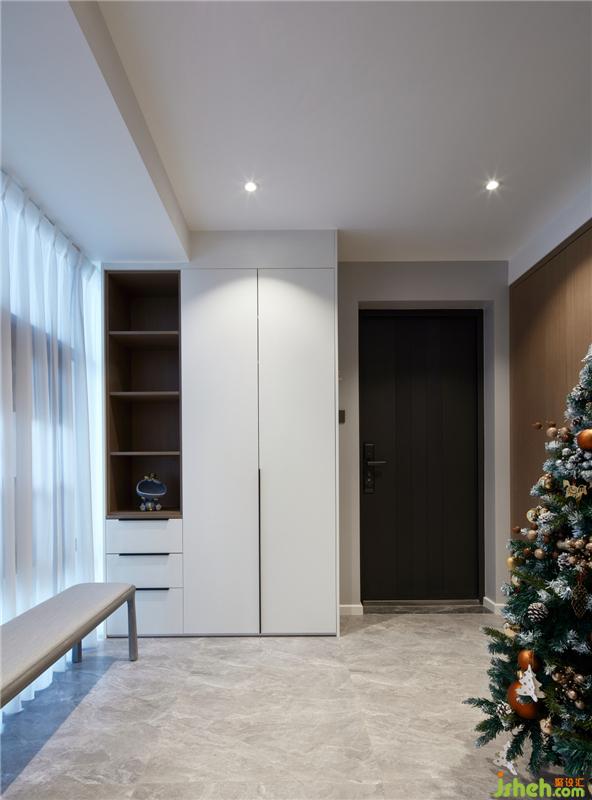 玄關(guān)的設(shè)計(jì)方便又實(shí)用,淺色的換鞋凳配上五金旋轉(zhuǎn)鞋柜與淺灰色的地板相得益彰 ,賦予空間平衡之美。
