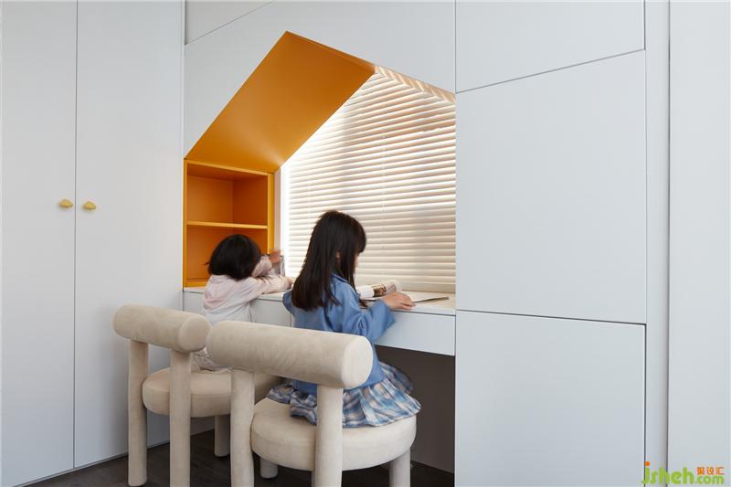 休息區(qū)、娛樂區(qū)、學(xué)習(xí)區(qū)動靜分明。溫馨又自然,適當(dāng)留白,剩下的伴隨成長留給她們自己去書寫。