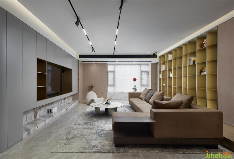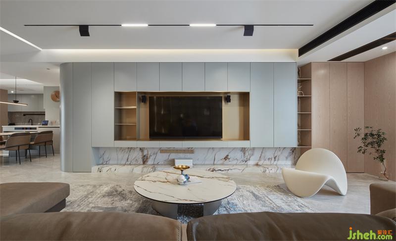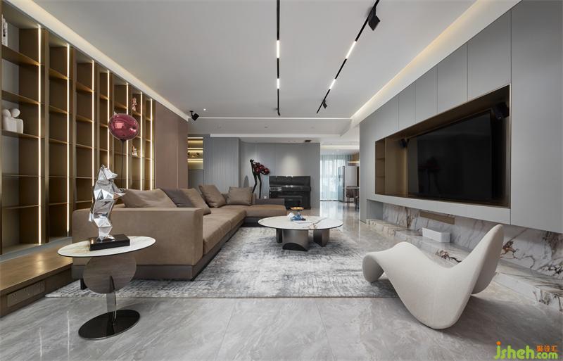 這個項目整體空間圍繞著現(xiàn)代風(fēng)格展開,弧形墻角是創(chuàng)造獨特空間的重要原則,是賦予空間深度、視覺豐富性和對比度的關(guān)鍵,客廳的書墻更是別具新意,灰色板材和木質(zhì)元素的結(jié)合,突出輕巧與精致,在和諧中變幻出具有現(xiàn)代之美的生活空間。