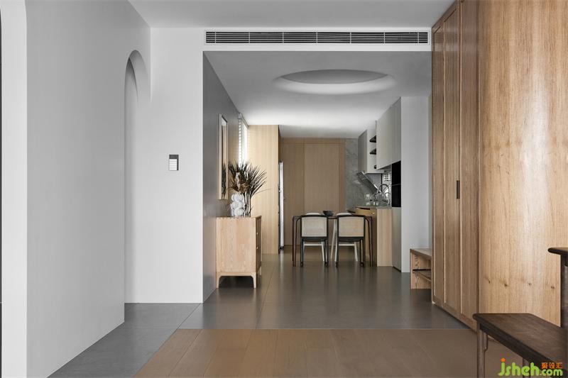 線(xiàn)條頂面,圓形燈膜,木色柜體相得益彰,形狀,材質(zhì),色彩,豐富空間層次,平衡視覺(jué)上的整體美感。