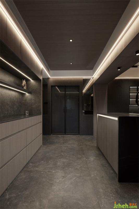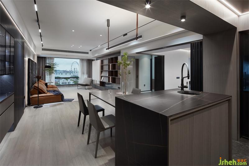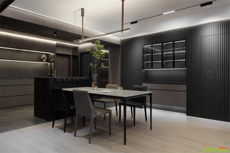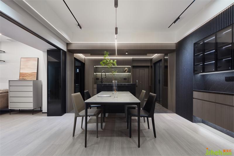 餐廳區(qū)域的天然取景框,將玄關(guān)劃分出來,啞光黑的巖板臺(tái)面,深圳家居設(shè)計(jì)搭配胡桃木元素,暗沉而高級(jí),在燈光的烘托下,大平層的既視感!采用木質(zhì)的長城板打造一個(gè)簡約大氣的背景墻,定制的原木餐邊柜鑲嵌于其中,在光與影的交錯(cuò)里,刻畫著生活的溫馨。