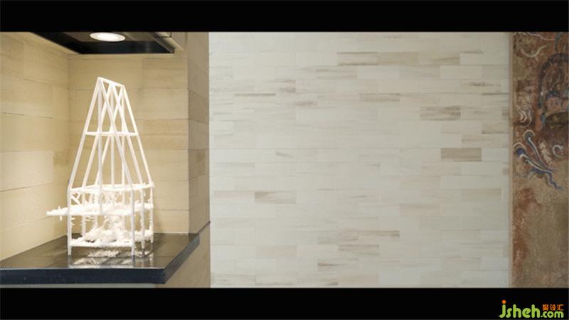 沙盤展示區(qū)右側結合了三處不同風格的藝術裝置——巖彩藝術敦煌泥板畫《“巖”述千年,天工開物》、榫卯結構海螺雕塑以及榫卯結構燈光墻。