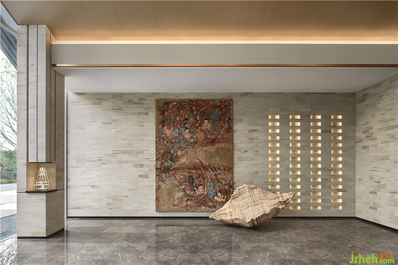 榫卯結構的藝術表達再次呼應賴特對于材料運用的觀點,在結合現代的功能與技術的基礎上,用榫卯結構的海螺與燈光墻面融合中國建筑符號與代表天地生息的海洋色彩。