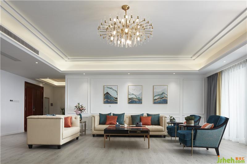 純潔的白色作為空間主體色,搭配簡潔利落的線條,沒有過多的裝飾,采用孔雀藍搭配橙色為客廳增添濃郁的色彩與背景裝飾畫相呼應。室內設計師