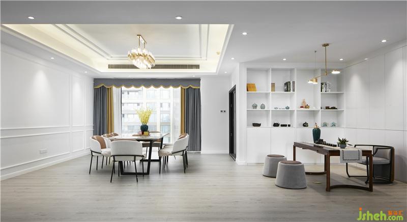 茶聊區(qū)運(yùn)用極簡(jiǎn)的設(shè)計(jì)手法,開放式的布局,造型干凈利落的頂面與墻面,體現(xiàn)出現(xiàn)代簡(jiǎn)約生活的品質(zhì)感。混合帶有新中式元素的家具,整個(gè)空間在白色的基調(diào)下,輔以精致的裝飾工藝品為點(diǎn)綴。室內(nèi)設(shè)計(jì)師