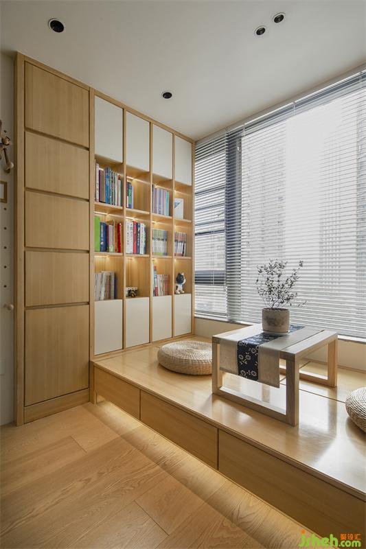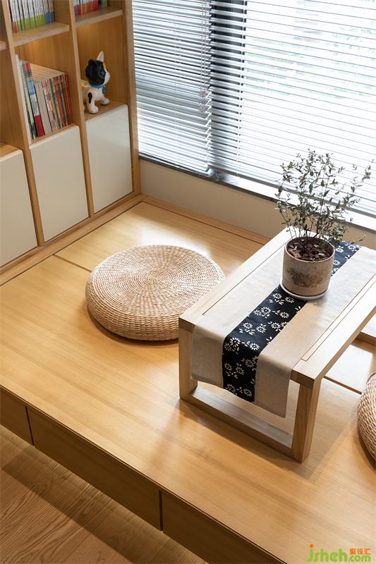 左邊設(shè)計了封閉式的柜門,斜邊暗拉手的設(shè)計延伸與右邊的層板柜橫板齊平;豎板用木色區(qū)分于白色柜門的設(shè)計手法,同時比柜門凸出1公分,視覺上顯得更流暢、立體感。