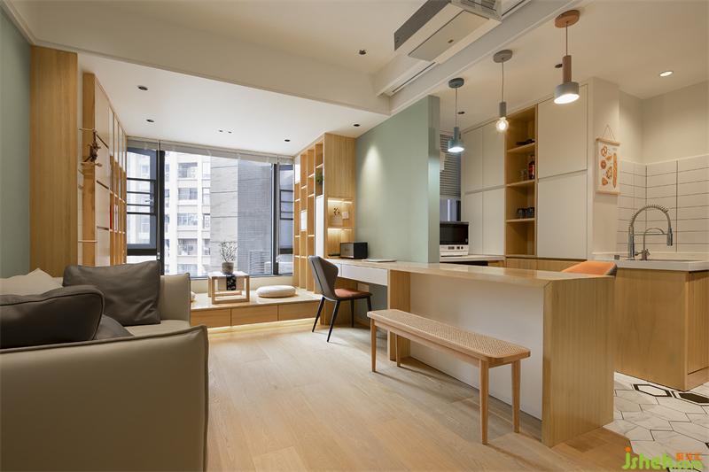 一進來就是視野寬闊的客餐廳,開放式的廚房與客廳之間是一個餐吧臺功能,連貫過去的是辦公寫字桌;客廳打破常規(guī)的電視墻體做法,采用投影幕布設(shè)計,把它隱藏到天花里面去,既美觀明亮又不占地方。餐吧臺后面的柜子中間做了木色的層板,顏色區(qū)分之后柜體的形狀比例和空間顯得高聳、立體,兩側(cè)做了白色啞光烤漆柜門把熱水器和下水管隱藏起來。
