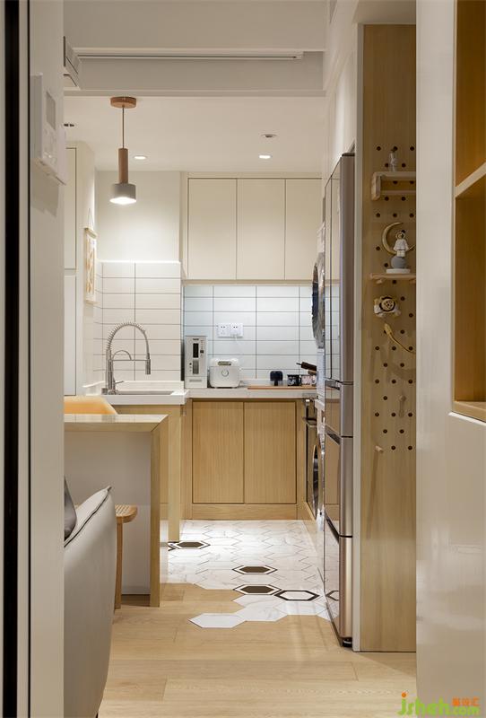 廚房地面六角磚與客餐廳木地板的碰撞,讓空間氣氛生動起來。