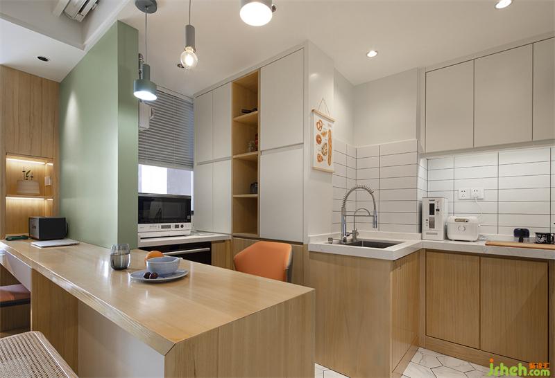 把原戶型廚房墻體打掉后,我們看到的是一個(gè)開(kāi)放式的廚房,餐桌是設(shè)計(jì)在廚房與客廳之間的位置,鏈接過(guò)去的是一個(gè)辦公桌,既延伸空間感,也增加與廚房、客廳的互動(dòng)性。;餐桌是廚房與客廳相互互動(dòng)的樞紐,餐桌下面做了可以儲(chǔ)物的功能,白色柜門(mén)的設(shè)計(jì)不會(huì)顯得沉重,反而視覺(jué)效果給人一種輕巧、自然的效果。辦公桌面對(duì)的是一副灰豆綠色的墻體。封閉墻體的設(shè)計(jì)讓這個(gè)區(qū)域顯得寧?kù)o、具有思考的空間。