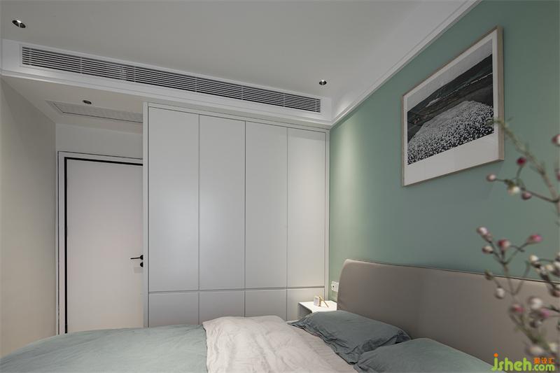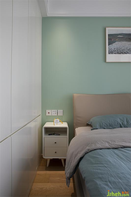 灰色調(diào)的布簾加上透光的紗簾,與豆綠色形成反差,增添了一份空間色彩。