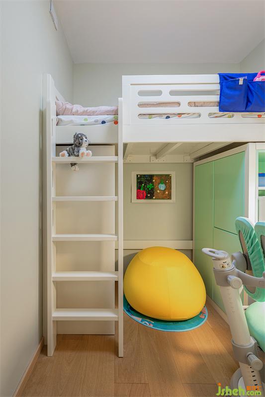 兒童房采用上下鋪是設(shè)計(jì),下面兩側(cè)是收納衣物的柜體,床架大面積是白色,柜門(mén)使用了嫩綠色作為襯托,在色彩設(shè)計(jì)手法上使得空間更明亮、清新、寬敞;同時(shí)中間的鴨黃色泡沫圓墊為這個(gè)空間增添了豐富的色彩。