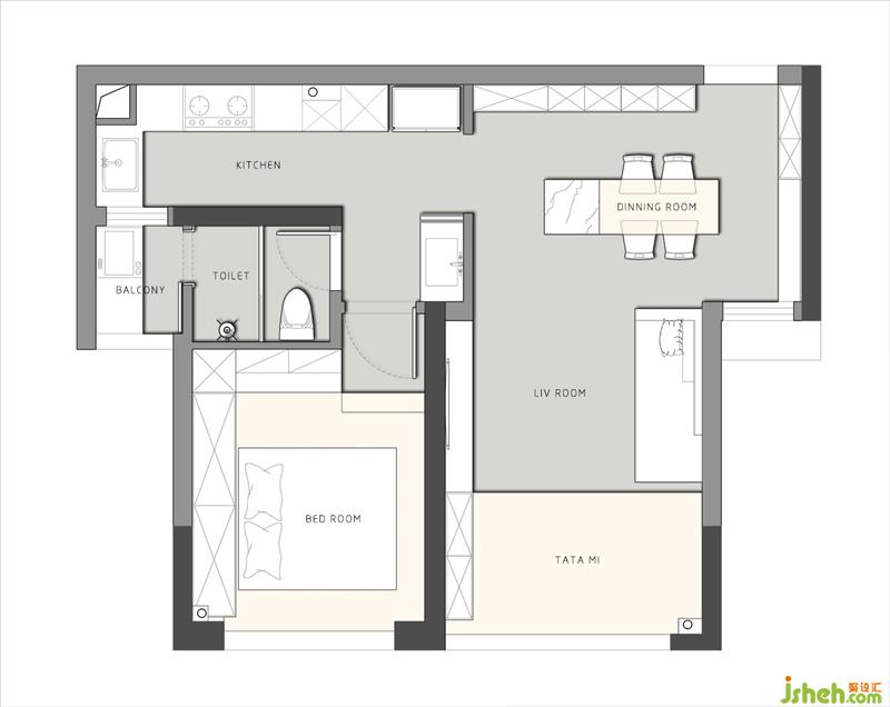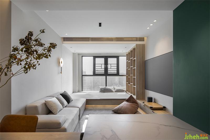 ④利用原來的大陽(yáng)臺(tái)設(shè)計(jì)成與客廳一體的榻榻米休閑空間,紗簾一拉上也是一個(gè)獨(dú)立的臥室。