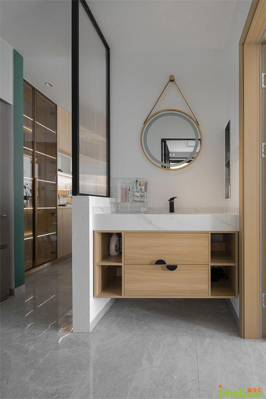 深圳家居設(shè)計(jì)洗手盆側(cè)面是砌了90公分的矮墻,上面設(shè)計(jì)了長虹玻璃,既通透既美觀;衛(wèi)生間門是做了水波紋的玻璃,讓它更生動和諧。