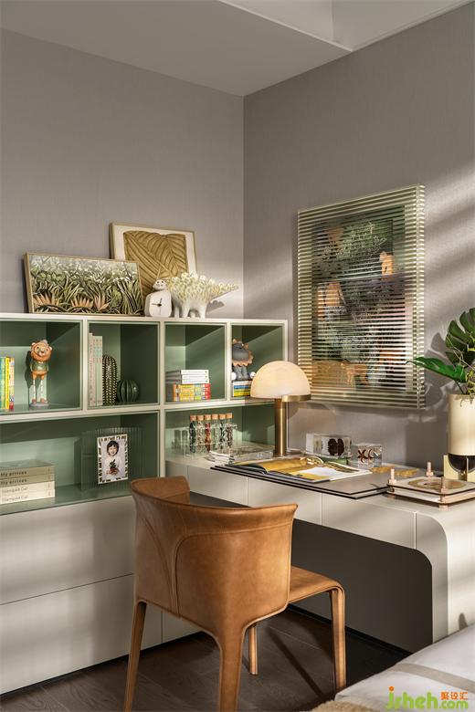 開(kāi)門見(jiàn)綠,沁人心脾。兒童房用綠意營(yíng)造氛圍,掛畫(huà)、書(shū)桌和綠植的不同介質(zhì)傳遞自然的信息,樣板間設(shè)計(jì)在陽(yáng)光的照射下溫柔呈現(xiàn),仿佛誤入自然之境,讓人情不自禁深入探索內(nèi)在的美好。