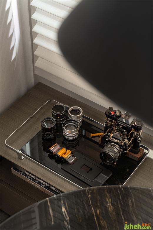 攝影主題的書(shū)房設(shè)計(jì)別具一格,亞克力透明陳列展示清晰明了,黑白灰的色彩彰顯理性的克制。樣板間設(shè)計(jì)藝術(shù)舒適的氣息彌漫整個(gè)空間,包容、隨性的生活理念也在此間蔓延。