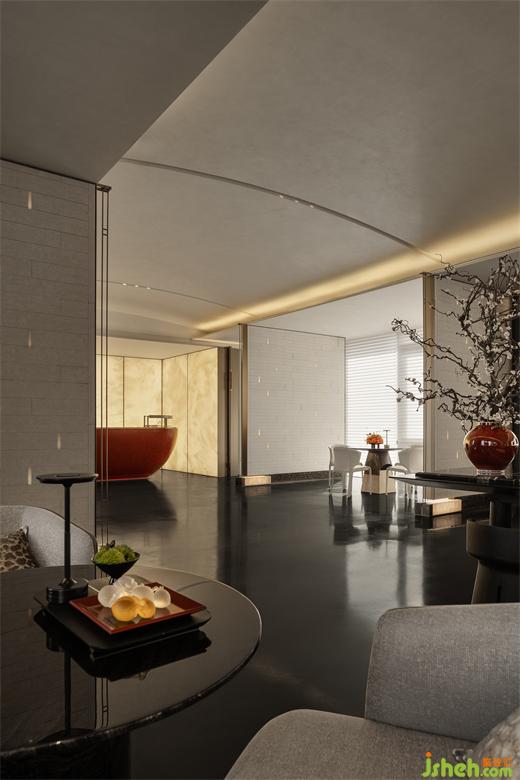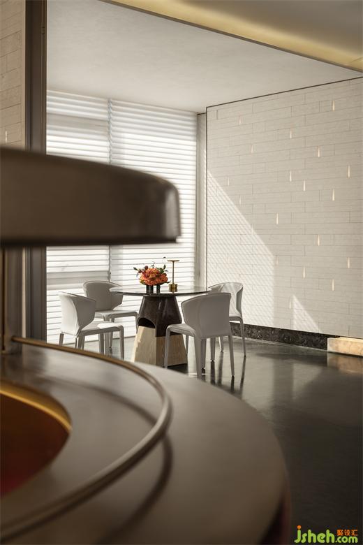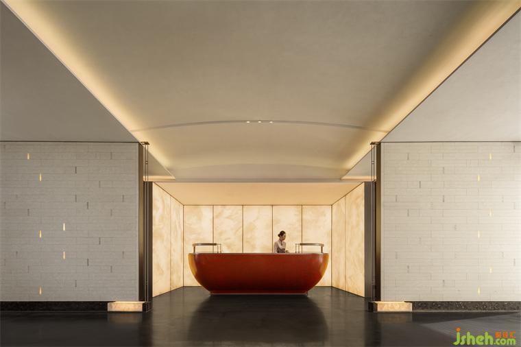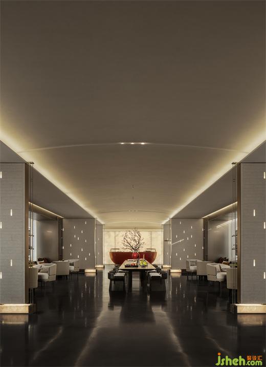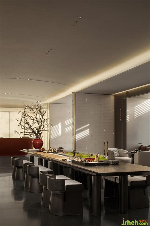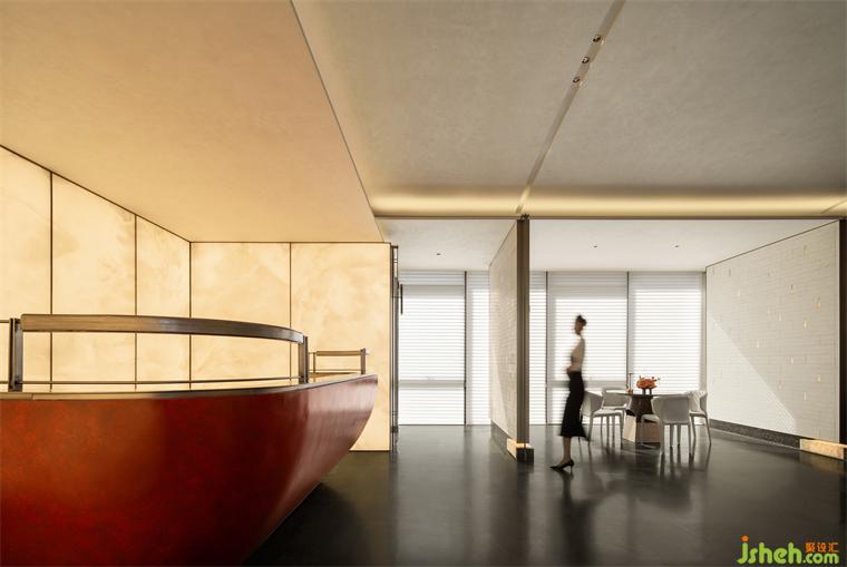 盡頭處,一抹朱紅猶如明亮的燭火,沉穩(wěn)中又不失華貴,盛唐風(fēng)韻撲面而來,再現(xiàn)繁榮昌盛的大唐氣韻,令人心馳神往。營銷中心設(shè)計柔和的光線與現(xiàn)代材質(zhì)的運用相得益彰,墻面仿佛張開溫暖的懷抱,包裹整個水吧臺,如玉般的溫潤恰到好處地輕撫空間每個角落,讓人心生寧靜、舒適。