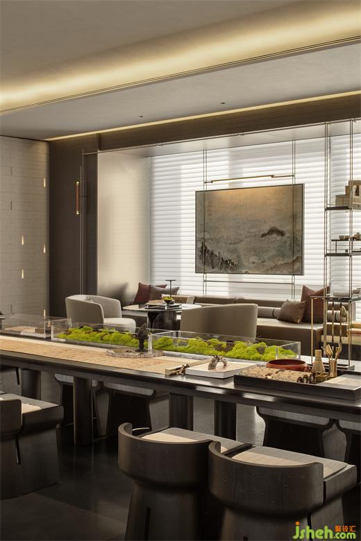 沿著空間中軸布置的木質(zhì)長桌作為洽談空間的視覺焦點,營銷中心設(shè)計師經(jīng)過精心雕琢,賦予其獨特的形態(tài)。桌臺上器物的巧妙擺放,增添了觀賞的樂趣。低頭俯瞰,是兩座微型山水,抬眼望去,筆墨輕輕寫就——“采菊東籬下,悠然見南山?!痹诠沤窠诲e中,生活便被賦予了別樣的趣味。