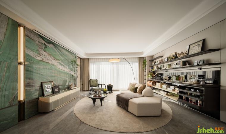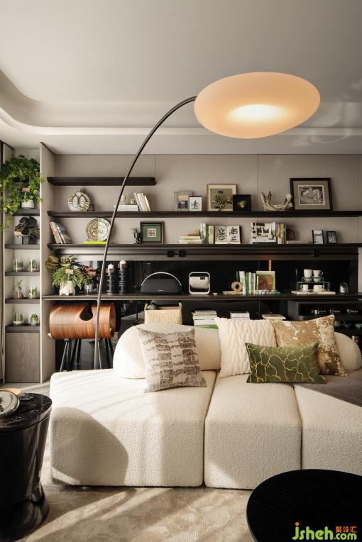 這是設(shè)計(jì)師為活力家庭量身定制的“生活劇場(chǎng)”。LDK一體化空間通過(guò)幾何形沙發(fā)與靈活桌椅布置構(gòu)建圍合式交流場(chǎng)景,可自由組合為咖啡研磨角、觀影空間或親子游戲場(chǎng)。6米通廳打破傳統(tǒng)邊界,背景墻以玉石般的光澤和紋路折射出自然意趣,懸浮書架層展示收藏的杯碟、書籍與音響,功能與展示的邊界在此消融。