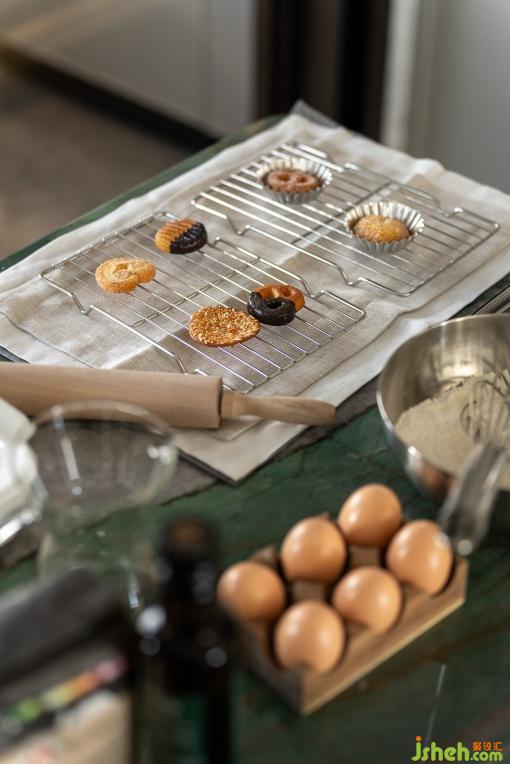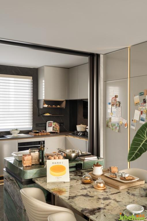 中央島聯(lián)動(dòng)餐桌與西廚,將用餐儀式感與生活煙火氣完美融合。大理石餐桌嵌套綠色島臺(tái),咖啡機(jī)的香氣與玻璃器皿的質(zhì)感交織。餐桌在早餐吧、臨時(shí)辦公桌、親子烘焙臺(tái)之間無(wú)縫切換,空間成為一場(chǎng)持續(xù)進(jìn)行的感官實(shí)驗(yàn)。