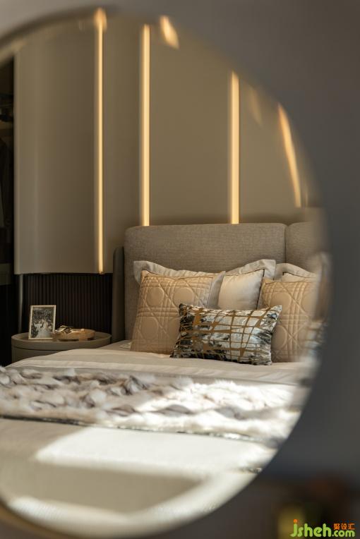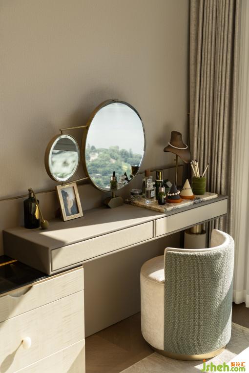 主臥以現(xiàn)代輕奢為筆觸,以暖灰與米白為主調(diào),通過材質(zhì)的碰撞與色調(diào)的鋪陳,勾勒出雅致舒適的休憩意境??臻g將功能收納隱于美學(xué)肌理之下,讓每一處轉(zhuǎn)角皆成為情感流動的載體,歸家即是一場五感喚醒的儀式。梳妝臺與床榻形成優(yōu)雅互動,梳妝椅以圓潤輪廓呼應(yīng)床榻的柔和線條,演繹出兼具實用功能與藝術(shù)質(zhì)感的居住美學(xué),讓每一處細節(jié)都成為生活品味的注腳。