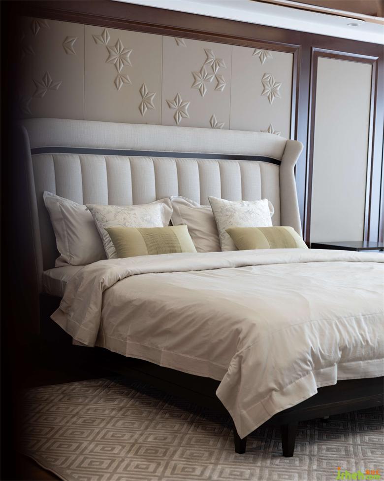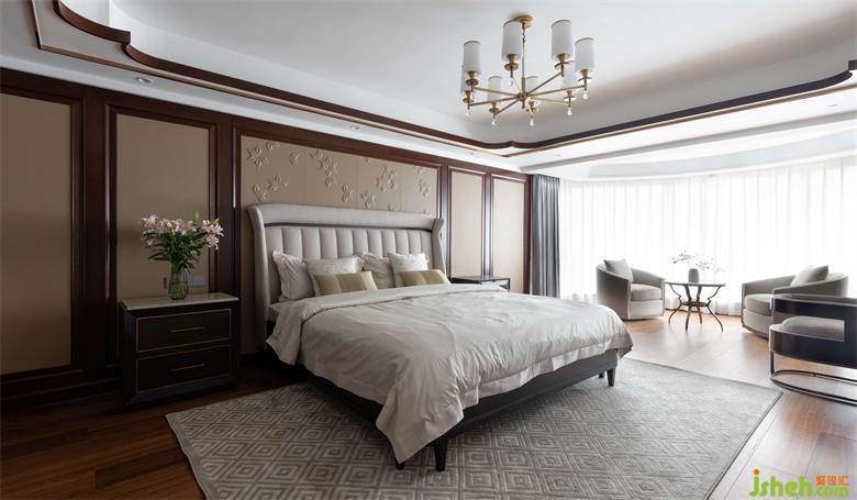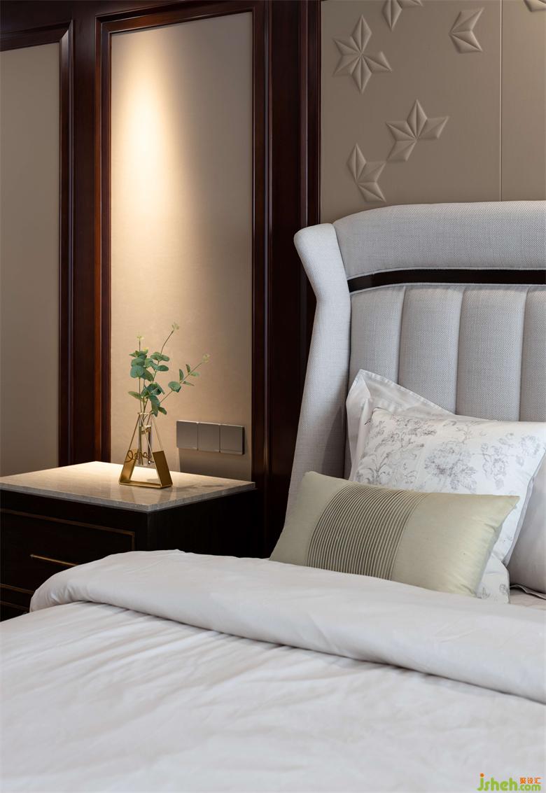 主臥整體色系給人一個(gè)溫馨的空間,墻面大面積采取藝術(shù)漆、背景墻主體設(shè)計(jì)胡桃木護(hù)墻板,家居設(shè)計(jì)配合著現(xiàn)代感的淺色硬包,為整體空間奠定了簡約時(shí)尚的格調(diào)。奢適的性能、精細(xì)的工藝,營造出大氣舒適氛圍的主人房。