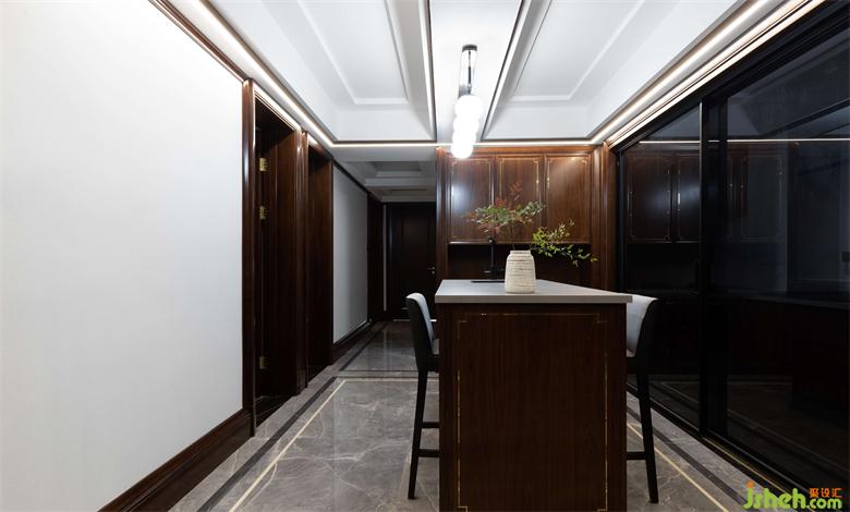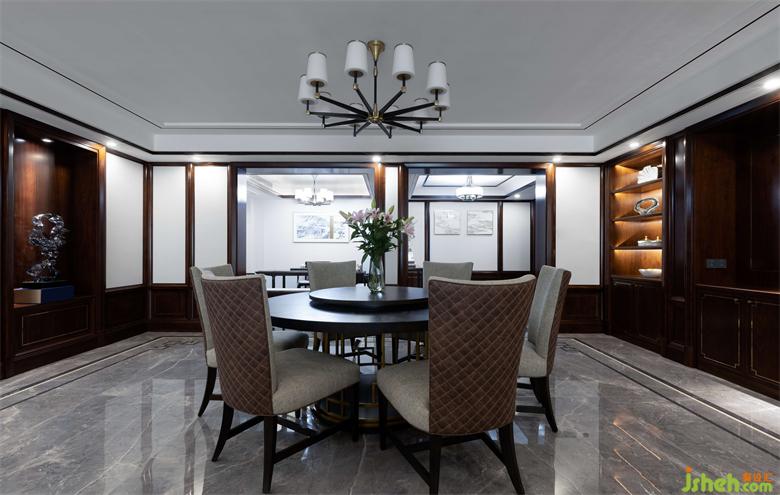餐廳高端的美克A.R.T.實(shí)木圓形餐桌,家居設(shè)計(jì)通過與地面的平花大規(guī)格地磚,深淺色調(diào)的配色,表達(dá)出不同材質(zhì)融合的魅力,使得每個(gè)家具獨(dú)立而不孤立。頂墻酒水柜使用高端胡桃木的實(shí)木柜,兼具裝飾、收納的職能,內(nèi)嵌的裝飾畫及裝飾品,彰顯主人輕奢的生活品味和格調(diào)。