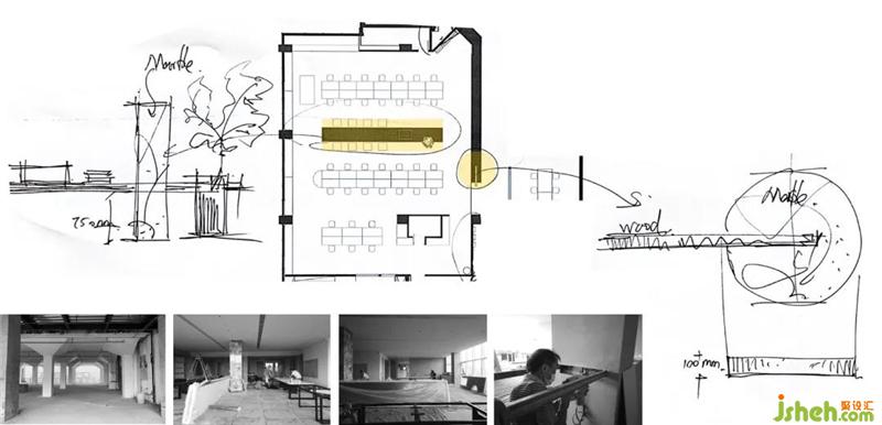 保留原建筑的大面積落地玻璃窗,把廣州珠江景色融入空間,外部光線通過落地窗照進室內(nèi)從而達到室內(nèi)光效氛圍,減少室內(nèi)過多人造光源。設(shè)計師刻意模糊了區(qū)域功能性,將空間至于一個看似僅為一個辦公空間,卻包含了辦公、休閑窗邊閱讀、小型討論、材料收納等到辦公日常所需功能,同時開放式的辦公方式解除了部門與部門之間的隔閡,減少溝通成本。