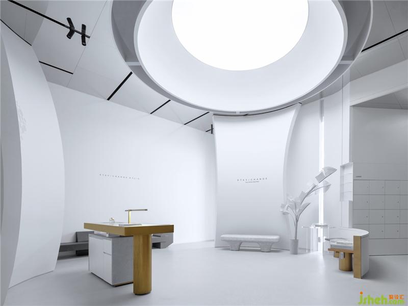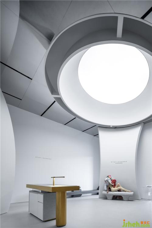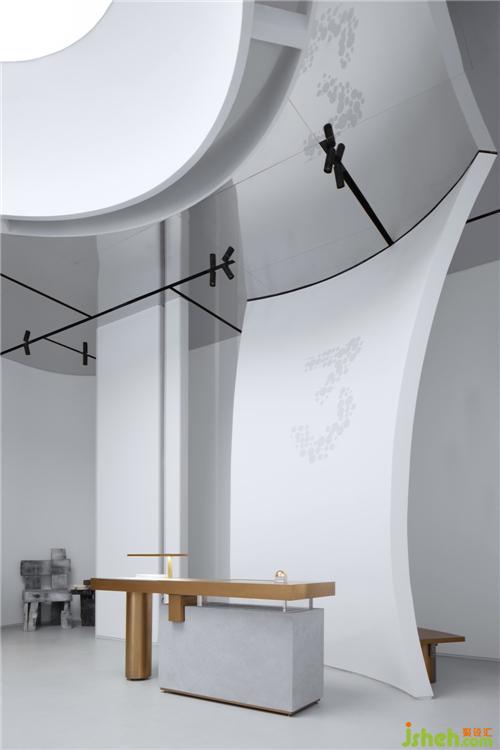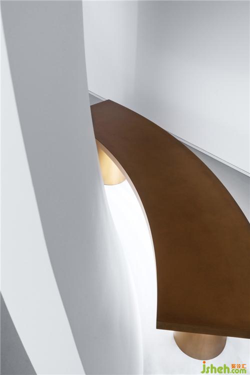 空間之間存在著感官上的節(jié)奏感,緊湊的,松弛的,流暢的,我們的空間感官被周?chē)绊懼?。入口用柔和的弧線(xiàn)展示歡迎的姿態(tài),等待觀(guān)眾投入它的懷抱。當(dāng)我們從入口緩緩進(jìn)入這個(gè)神秘的空間,謹(jǐn)慎的空間感官才被突然張弛開(kāi)來(lái),一緊一放之間帶給人驚喜之感。