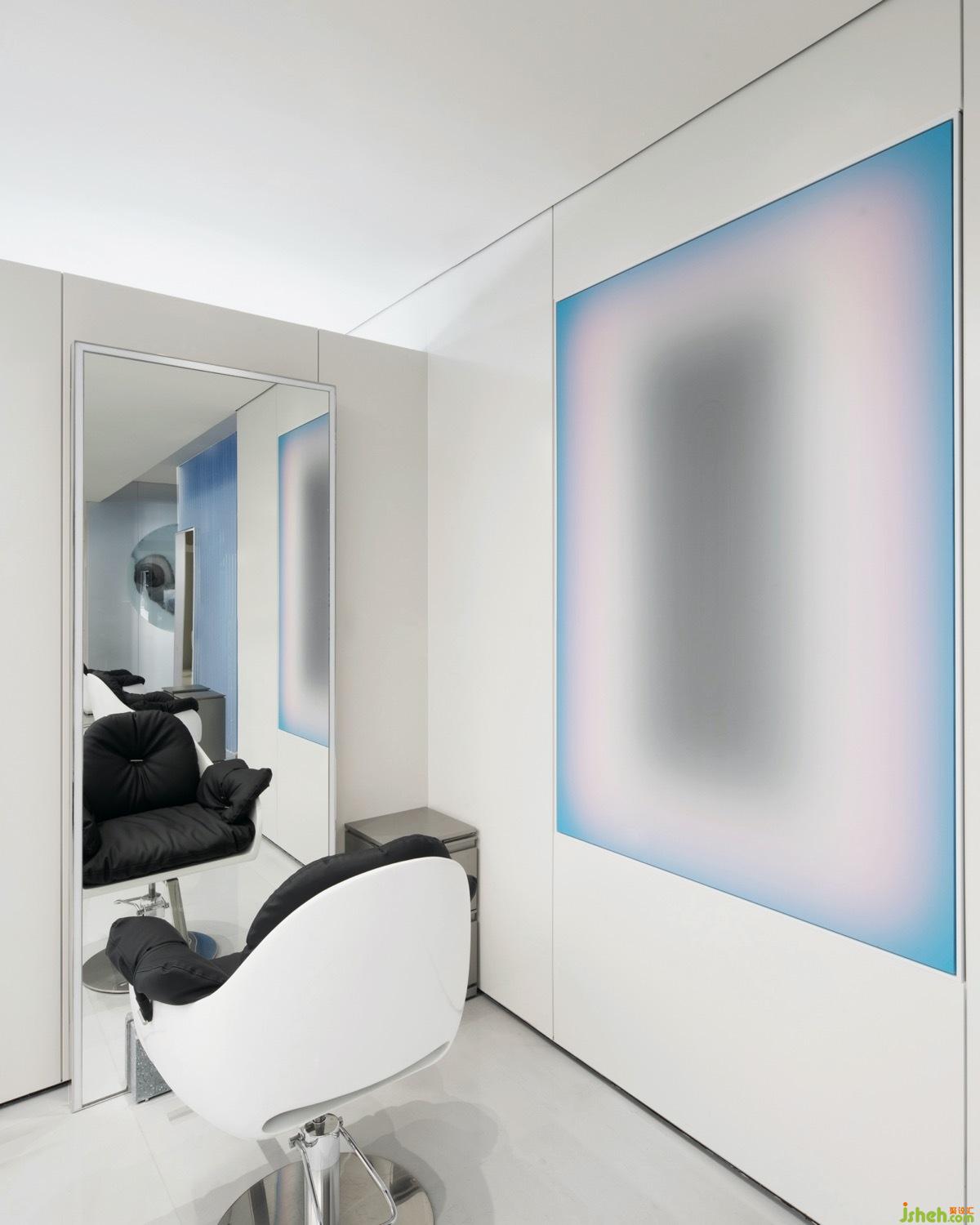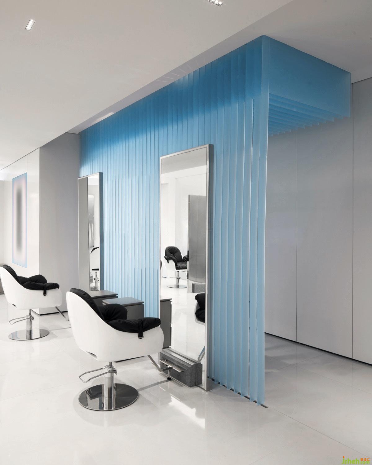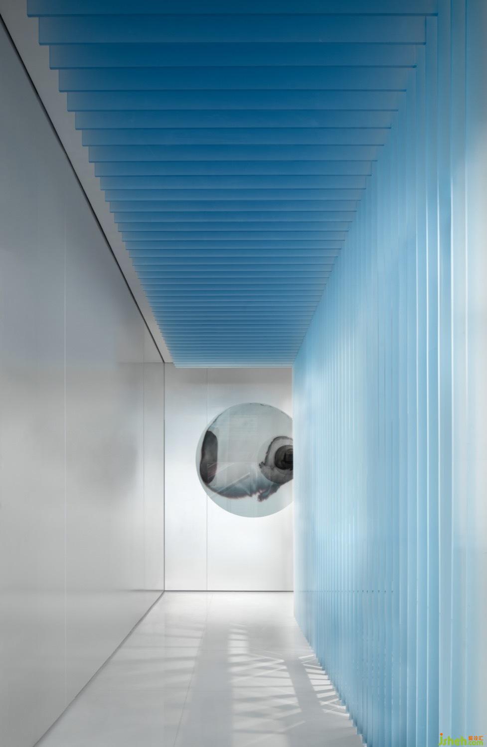 美發(fā)沙龍?jiān)O(shè)計(jì)空間中選用朦朧神秘感的藍(lán)色,以一種若隱若現(xiàn)的姿態(tài),彷如神秘維度里的一束的光。撥開迷霧觸摸光,空間被賦予層層遞進(jìn)的生命探索感,步入空間前區(qū),不禁萌生好奇,充滿藝術(shù)氛圍的空間究竟承載著怎樣的故事與用途?
