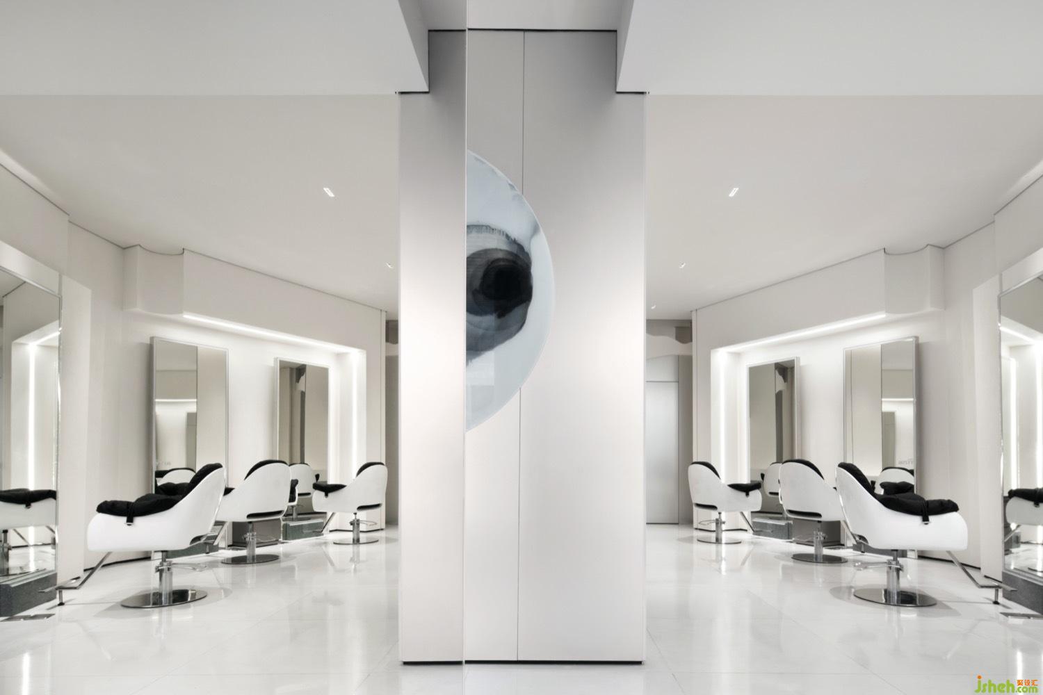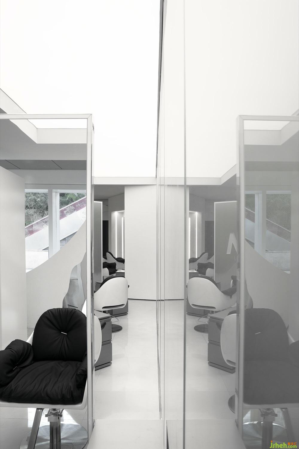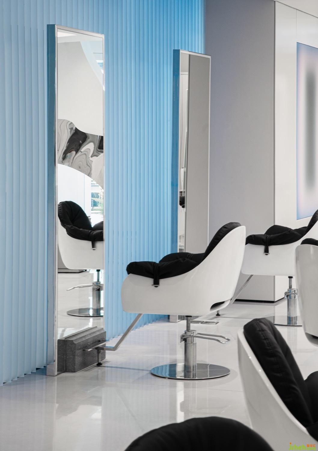 理發(fā)椅前選用的大面積方形鏡子增強(qiáng)了空間的縱深感和空闊感,讓打斷的線條被重新鏈接起來(lái),形成對(duì)立和平衡的“新”空間