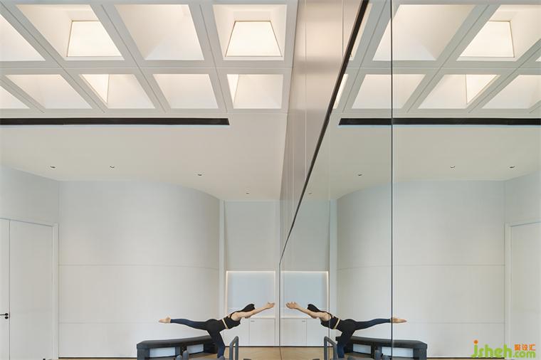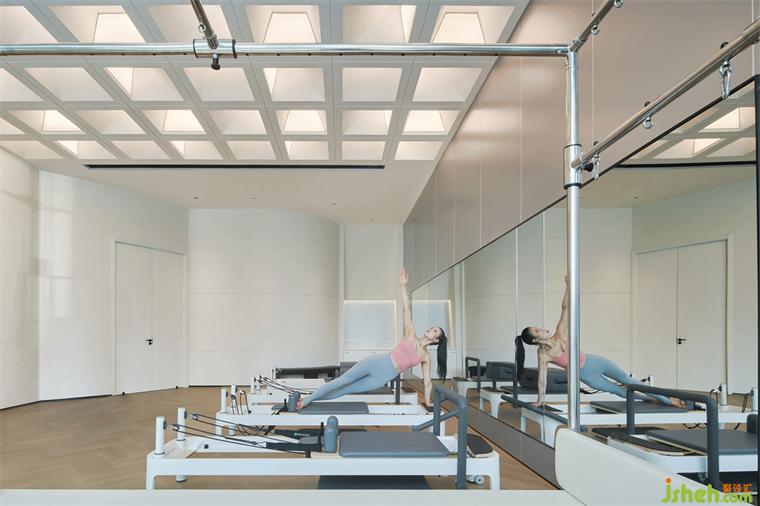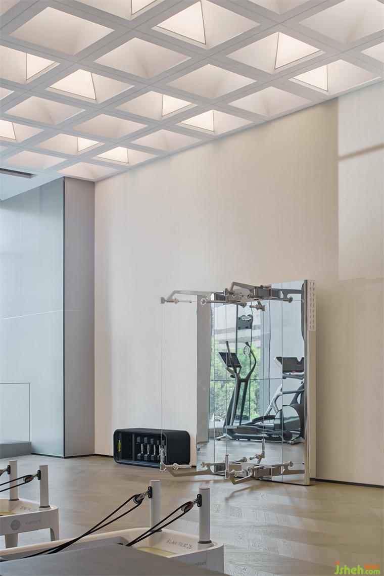 普拉提區(qū)利用格柵天花緩解空間的封閉感,旗艦店設(shè)計(jì)暖白色燈膜營(yíng)造專屬的純粹氛圍,柔軟又感性。