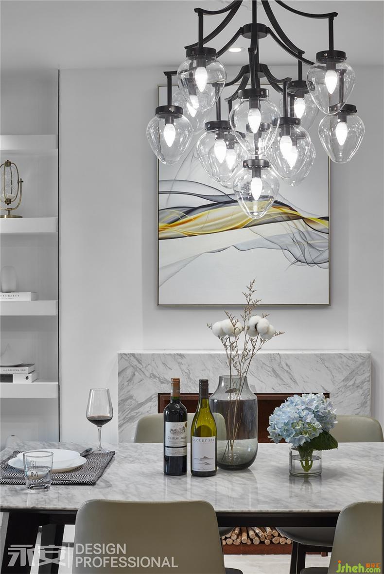 穿過(guò)玄關(guān)進(jìn)入一個(gè)干凈利落的空間,定制的深色多功能金屬架與整個(gè)氛圍相輔相成,賦予空間獨(dú)特的魅力??筒蛷d一覽無(wú)余,客餐廳合二為一,復(fù)古雕花、石膏角線(xiàn),古典與現(xiàn)代的巧妙碰撞,藝術(shù)和抽象的軟裝造型為空間帶來(lái)極具張力的感覺(jué),現(xiàn)代時(shí)尚風(fēng)格與細(xì)膩的藝術(shù)氣息的植入,使空間特質(zhì)既滿(mǎn)足了現(xiàn)代創(chuàng)新的審美訴求,又有古典的優(yōu)雅,散發(fā)陣陣詩(shī)意和濃郁的現(xiàn)代人文氣息,于形與意、態(tài)與勢(shì)之間展露出沉穩(wěn)的貴族風(fēng)范。藝術(shù)漆鋪就墻面,形成空間流暢連續(xù)的過(guò)渡。色彩鮮明的藝術(shù)畫(huà)帶來(lái)精神世界的營(yíng)養(yǎng)供給,沙發(fā)線(xiàn)條利落,塑造大氣沉穩(wěn)風(fēng)范。
